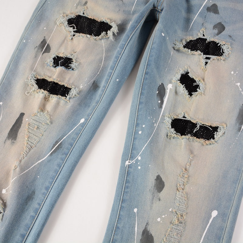 Regular fit, mid rise, relaxed tapered leg, belt loops, branded hardware, contrast stitching, all-over distressed panels and abstract pattern, partially lined