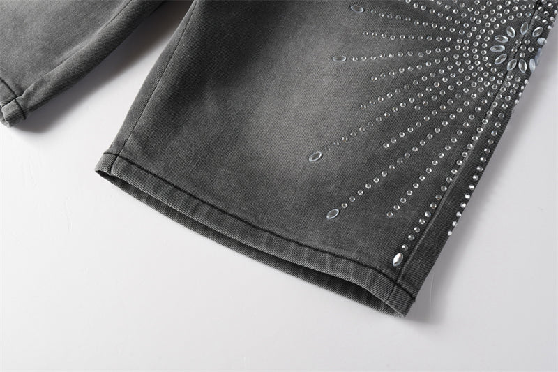 Regular fit, mid rise, relaxed tapered leg, belt loops, branded hardware, contrast stitching, all-over distressed panels and abstract pattern, partially lined